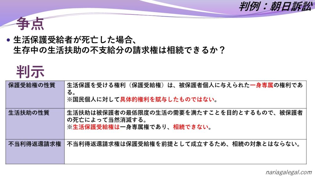 朝日訴訟は、生活保護受給権の相続可能性が争点となった裁判です。