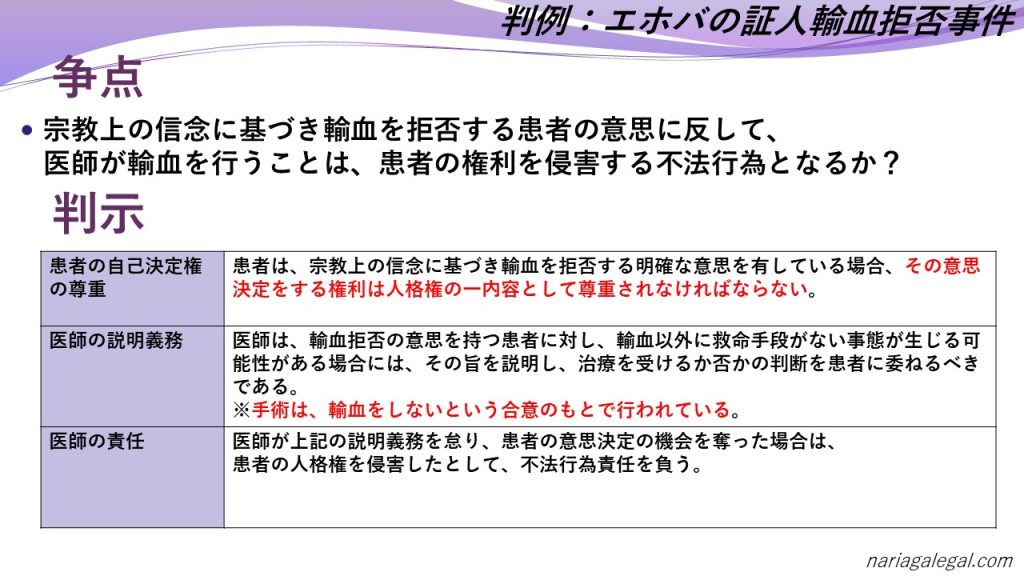 この判例では、エホバの証人である患者が宗教上の理由から輸血を拒否しましたが、医師が輸血を行いました。