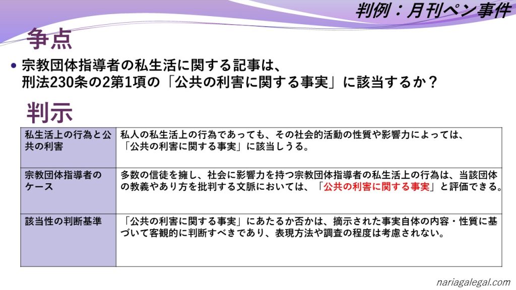 月刊ペン事件では、池田会長の私生活に関する記事が、公共の利害に関する事実と言えるかどうかが争点となりました。