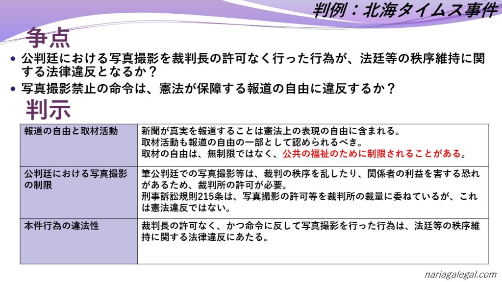 北海タイムス事件は、報道の自由の重要性を認めつつも、それが無制限に認められるものではなく、公益のために制限される場合があることを示した重要な判例です。