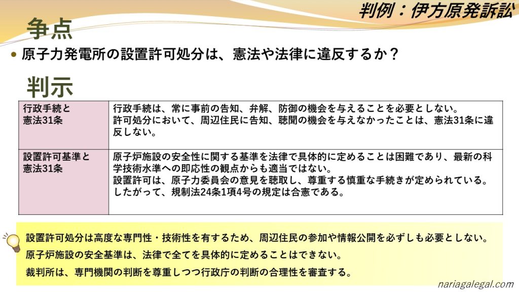 - 行政手続きの適法性:原発の設置許可処分は、憲法や法律に違反していないか?特に、住民への説明や意見聴取の機会が十分に確保されているか?