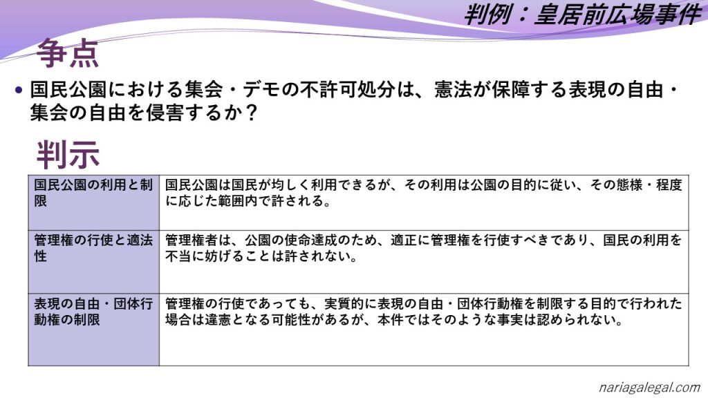 争点:国民公園における集会・デモの不許可処分は、憲法が保障する表現の自由・集会の自由を侵害するか?