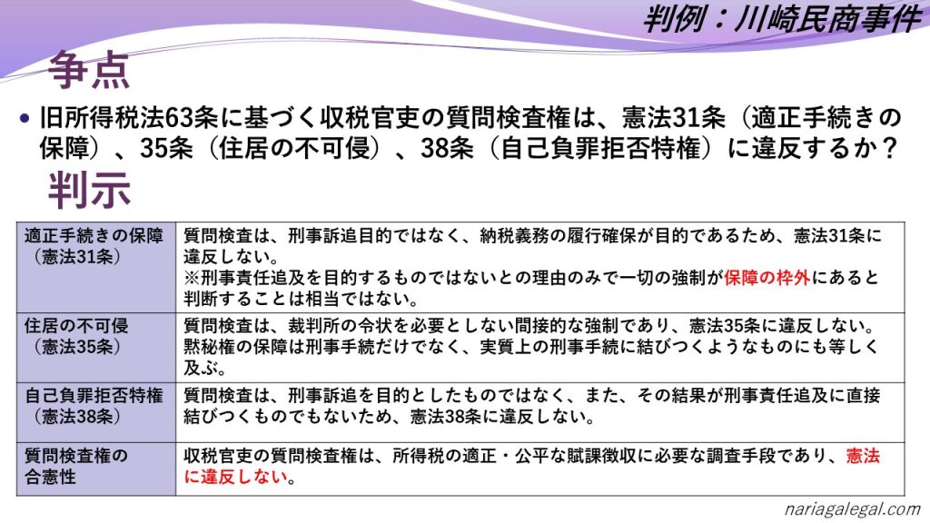 • 最高裁は質問検査権を合憲と判断:適正な課税を行うためには、税務署にある程度の調査権限が必要であり、憲法違反ではないと判断された。