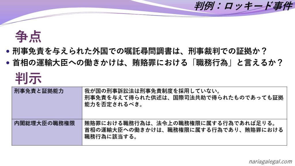 ロッキード事件では、刑事免責と引き換えに得られた供述の証拠能力が問題となりました。