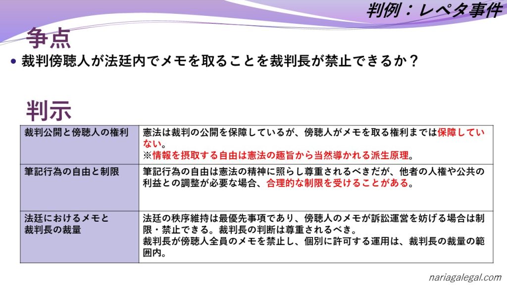 - 公開裁判の原則と傍聴人の権利:憲法は裁判の公開を保障していますが、それは傍聴人が自由にメモを取れる権利まで保障しているわけではない。