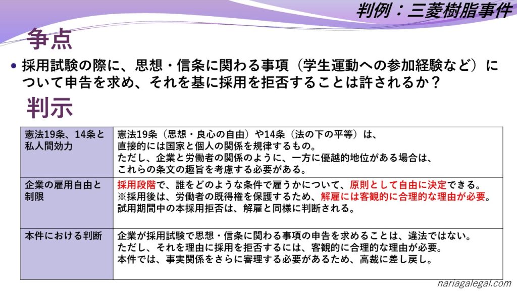 三菱樹脂事件は、企業の採用における自由と、個人の思想・信条の自由とのバランスを問う重要な判例です。