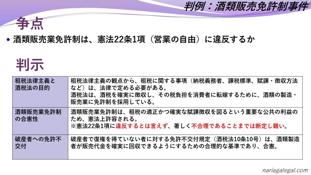 - 最高裁は免許制を合憲と判断:酒税の確実な徴収という公益のため、免許制は必要かつ合理的であり、憲法違反ではないと判断された。