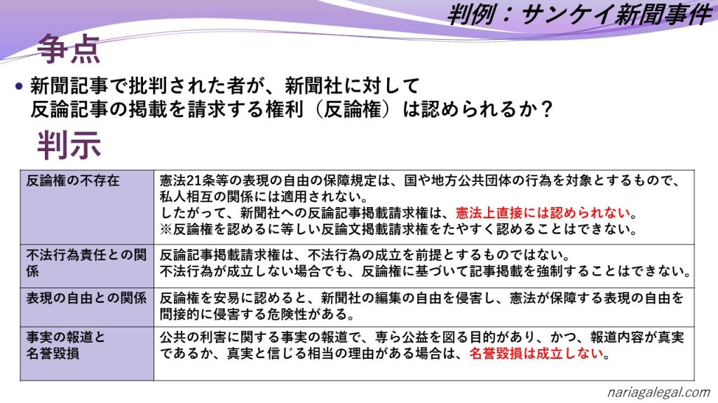 この判例は、反論権が憲法上直接には保障されていないことを明確にしました。