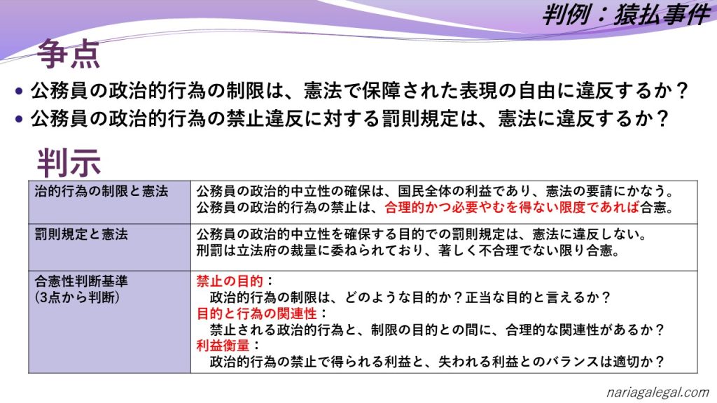 これらの3つの観点から総合的に判断し、制限が憲法に違反しない範囲内であるかを確認する必要があり、特に、公務員の政治的中立性の確保という目的は、国民全体の奉仕者としての公務員の職務の性質から、憲法の要請にかなうものであると言える。としています。