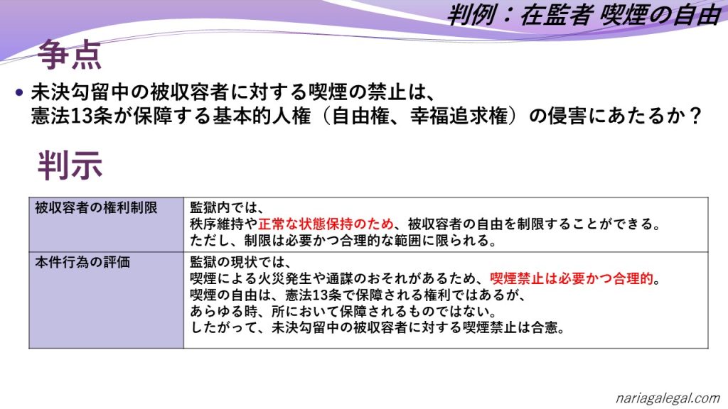 在監者、喫煙の自由のポイントは、被収容者の権利も憲法によって保障されているものの、監獄という特殊な環境下では、安全確保や秩序維持のために制限される場合があるということです。